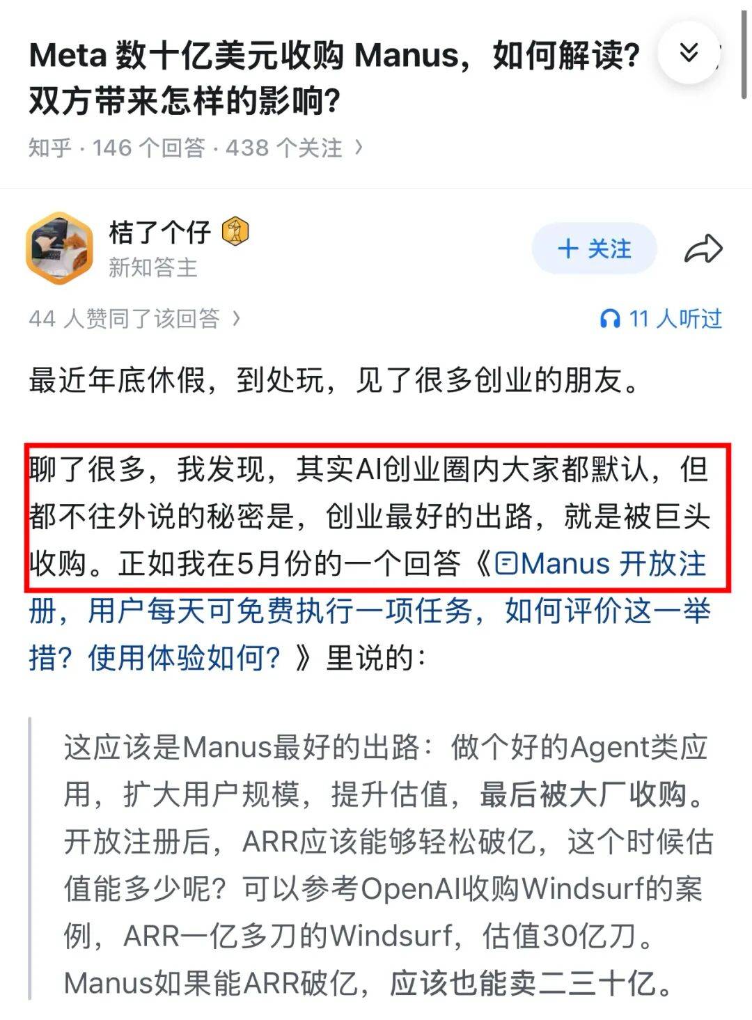 当然,大伙儿也有一些共识,那就是这事儿对 Meta 有没有好处不好说,对 Manus 团队可是实打实的一步登天。