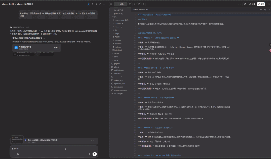 世超也去亲手试了试最新的免费版 1.6 Lite,让它从 0 开始,完成一个 “ AI 发展史时间轴 ” 网页,要包括文案结构、HTML 框架、和占位图片说明。