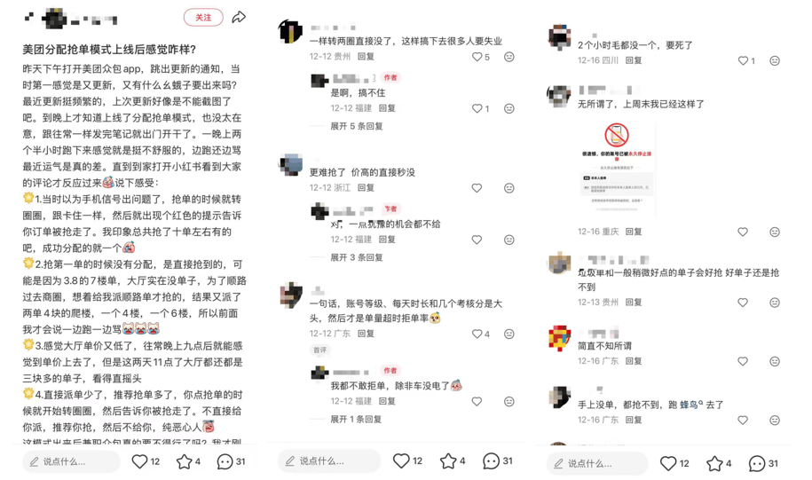 据了解,美团的分配抢单模式是在12月中旬开始推行的功能优化,目前通过线上社交平台大致统计出,广州、东莞、佛山、长沙等地都已经开始实施了。