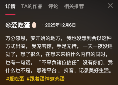 这种信任裂痕迅速蔓延,将他往后的一举一动都推向了舆论的审判台,爱吃蛋此前的发言都被翻出,被审视,成为一道道回击他自己的回旋镖。