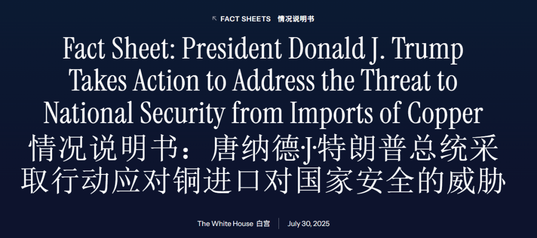 今年中特朗普签署公告,宣布对进口的半成品铜产品 (如管材、线材)和铜衍生品加征关税。