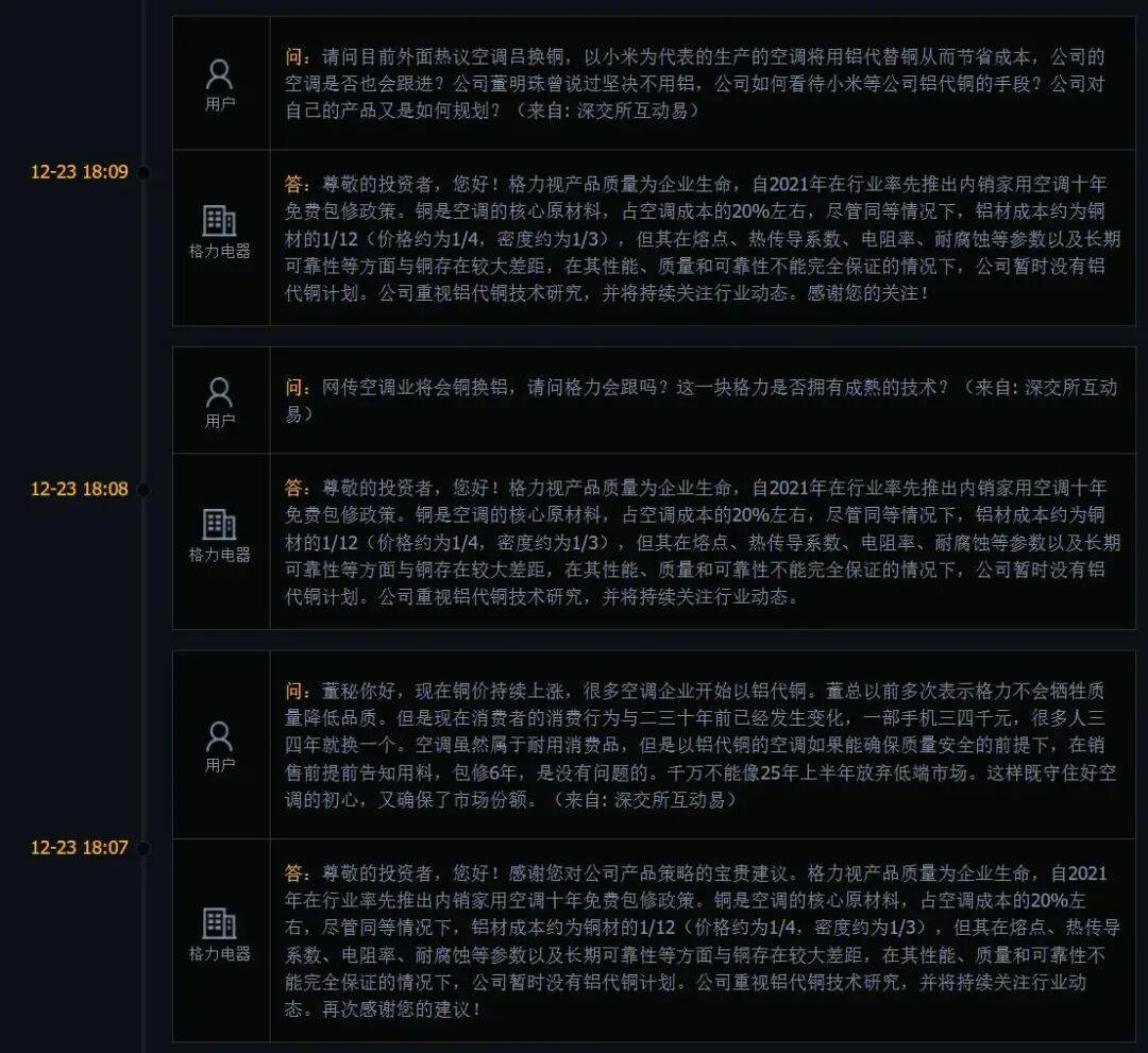 月底的时候,格力又在互动平台明确表示,公司暂时没有铝代铜计划。
