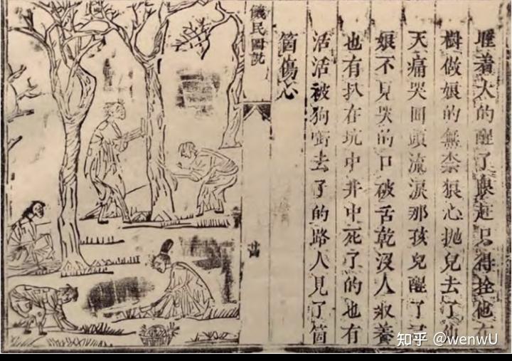 这几个孩儿都是前面妇人生的,只为年荒饥饿……只得将儿割舍。又恐小的醒了啼哭,只得哄他睡着;大的醒了跟赶,只得栓他在树……那孩儿醒了,寻娘不见……也有扒在坑中井中死了的,也有活活被狗叼去了的,路人见了,个个伤心。”