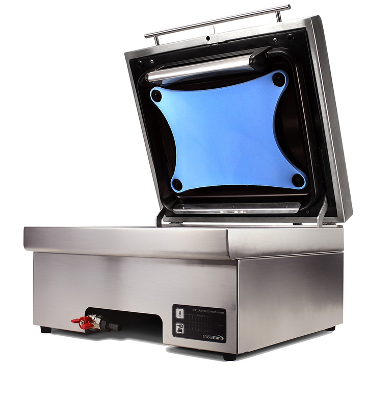 这玩意儿看起来像个不锈钢微波炉,底部是一个装有盐水的海绵托盘。你把龙虾放上去,盖上盖子,机器会释放 110 伏、5 安培的电流,只需 0.5 秒就能让龙虾失去知觉,10 秒内彻底死亡 。