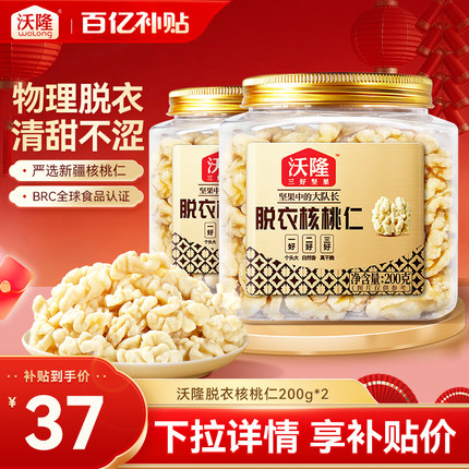 去壳脱衣核桃仁,原味无添加,果仁饱满,无涩味,颗颗醇香酥脆。目前200g*2罐天猫商城沃隆旗舰店售价¥45,APP端下拉至详情页面点击“百亿补贴”下单实付¥37包邮。