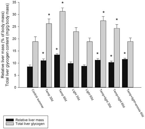 随着秋天水温从 18 度降到 4 度,温度的降低作为信号,触发了鲫鱼肝脏内糖原合酶的活性 。它们开始疯狂地囤积糖原,到了入冬前,鲫鱼的肝脏会膨胀到体重的 15%甚至更多,其中糖原含量高达 30%,这是已知脊椎动物中最高的糖原储存密度[6] 。