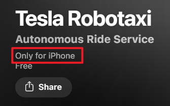 打车需要用到Tesla Robotaxi这个APP,来了才发现这个APP只上架了苹果的App Store,安卓的Play商店是没有的。只服务iPhone用户,可以,这很“美利坚”。