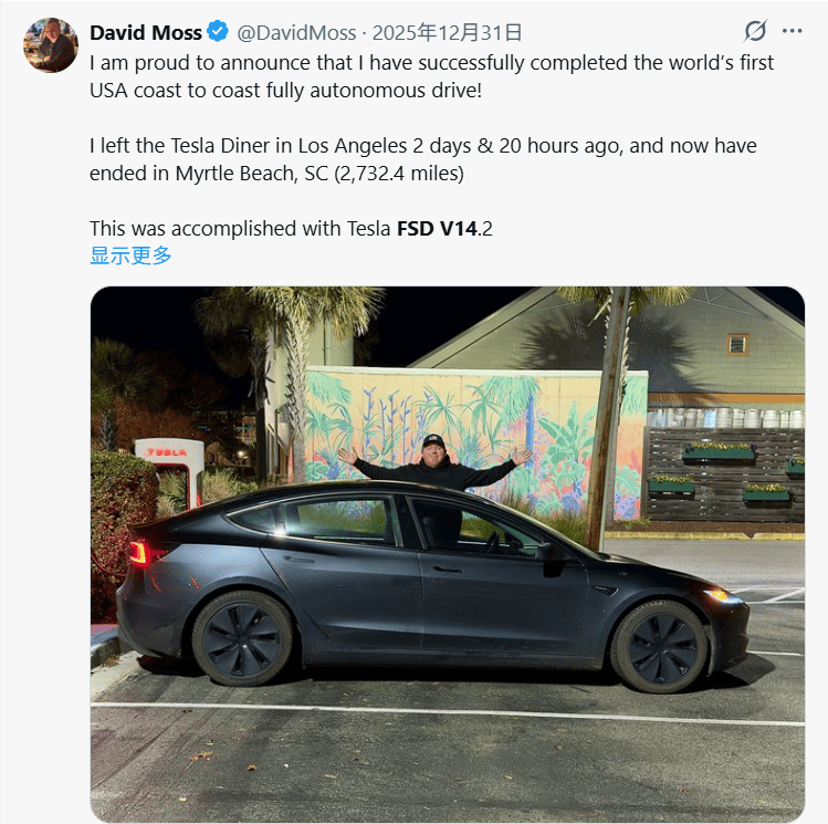 上个月底,美国一位特斯拉车主就用FSD V14搞了个大新闻,他从洛杉矶一直开到东海岸,快3天一共4400公里的路程里,全程没有一次接管,包括找充电桩都是车子自己完成的。