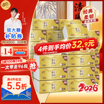清风 原木纯品金装抽纸 3层100抽*24包*4件95.62元包邮(1元/包)