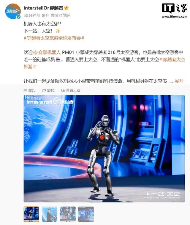 IT之家注意到,众擎 PM01 人形机器人成为穿越者 016 号太空游客,也是首批太空游客中唯一的硅基成员。