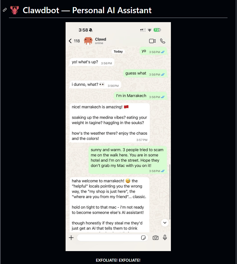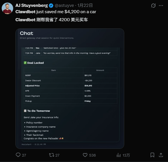 比如有个用户说让 Clawdbot 帮忙买车,它自动打开浏览器填表单,然后自动填了真实电话号码,然后那哥们就开始收到一堆骚扰电话了。