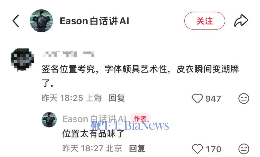 有网友评论称,“签名位置考究,字体颇具艺术性,皮衣瞬间变潮牌。”