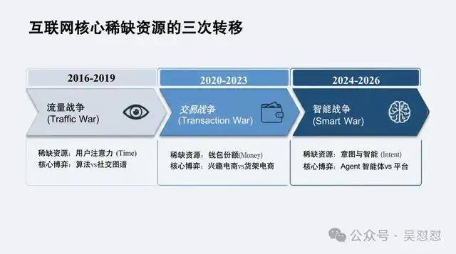 新BAT十年战争的本质,是互联网核心稀缺资源的转移:从2016年争夺用户注意力的流量战争,到2020年争夺用户钱包份额的交易战争,再到2024年随着生成式AI爆发而升级的智能战争。