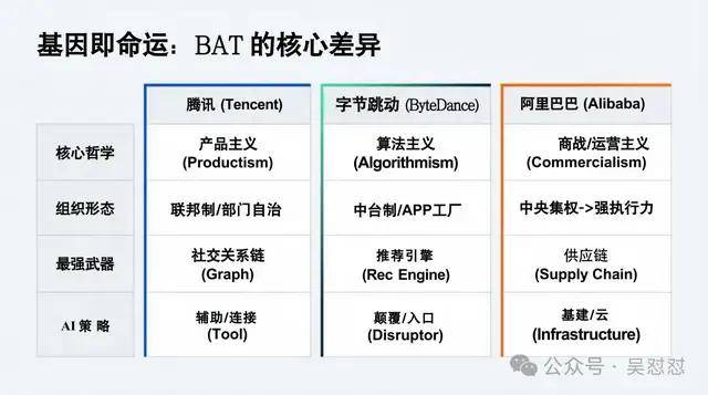 旧的“BAT”铁三角(百度、阿里、腾讯)早已解体,取而代之的是更加血腥的“新BAT”格局——B(ByteDance)成为了新的引力中心,A(Alibaba)在AI时代重塑阿里,T(Tencent)则依靠深不见底的社交与游戏护城河与之对峙。