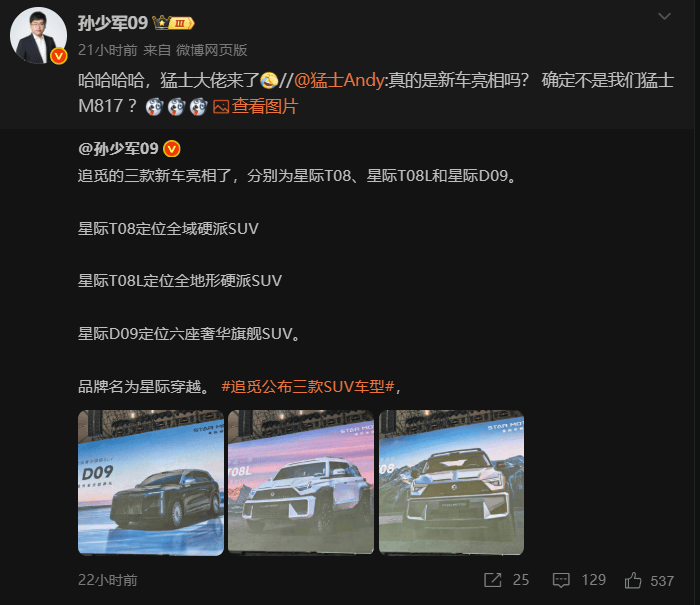 大伙再重温一下啊,这是追觅昨晚发布的星际 T08 和星际 T08L ,它们的下方,则是现在我们能在市面上买到的两款新能源 SUV 车型,东风猛士 M819 和猛士 917 。