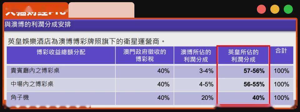 博彩税收走40%,澳博抽成4%左右,56%的收益,都归英皇,差不多一年12亿左右。