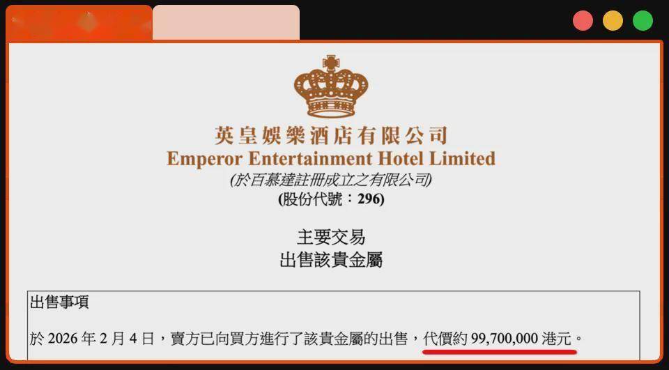 英皇娱乐酒店发公告说,这78公斤的黄金,卖给了德国的贺利氏,套现9970万港元。