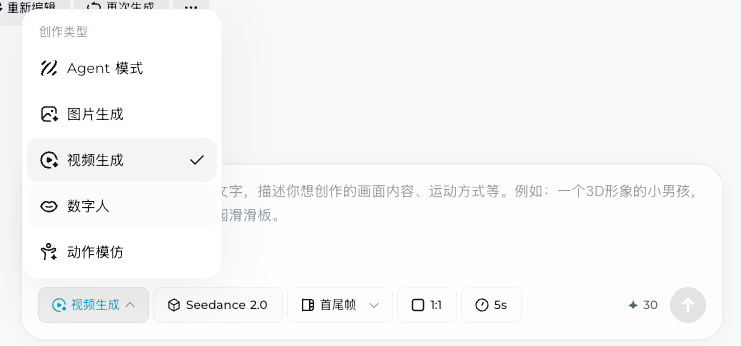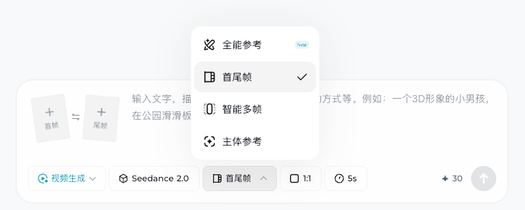 它的逻辑非常清爽,打开即梦(jimeng.jianying.com)在最底下选择“视频生成”,在边上把生成视频的模式给切换成“全能参考”,或者是“首尾帧” 之后,就可以用上最新的 Seedance 2.0 模型。