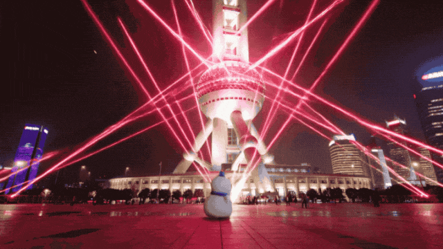 在上海的东方明珠塔下,生成东方明珠塔用激光攻击蜜雪冰城雪王的视频,