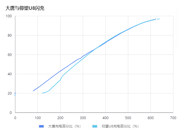 由于比亚迪闪充车机上是没有显示充电功率的,所以我还一帧一帧的统计了大唐和仰望 U8 的充电百分比和续航,可以看到,比亚迪闪充的功率输出非常的平稳。
