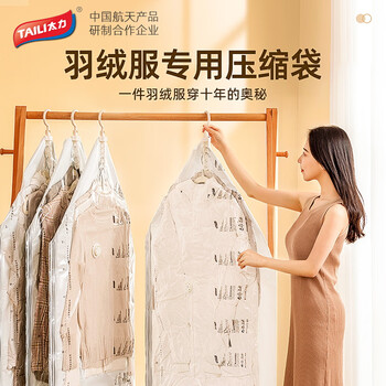 换季收纳必备!科学压缩,不伤羽绒服,专利免抽气真空压缩袋,轻松按压,不用泵,3秒速排。目前短款4件套京东商城太力官方旗舰店售价¥51.3,下单9折,领取¥15-7优惠券,实付¥39.17包邮,单个约可收纳3-5件厚羽绒服,节约衣柜空间!
