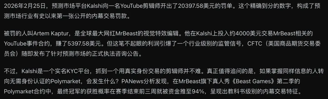 而他的一位视频剪辑师,利用自己能提前看到视频后台数据(比如发布时间、内容方向)的「职务便利」,在Kalshi上精准下注了大约4000美元。平台的监控系统发现他的交易成功率高得离谱——在极低赔率的盘口上几乎「百发百中」,统计学上几乎不可能是巧合。