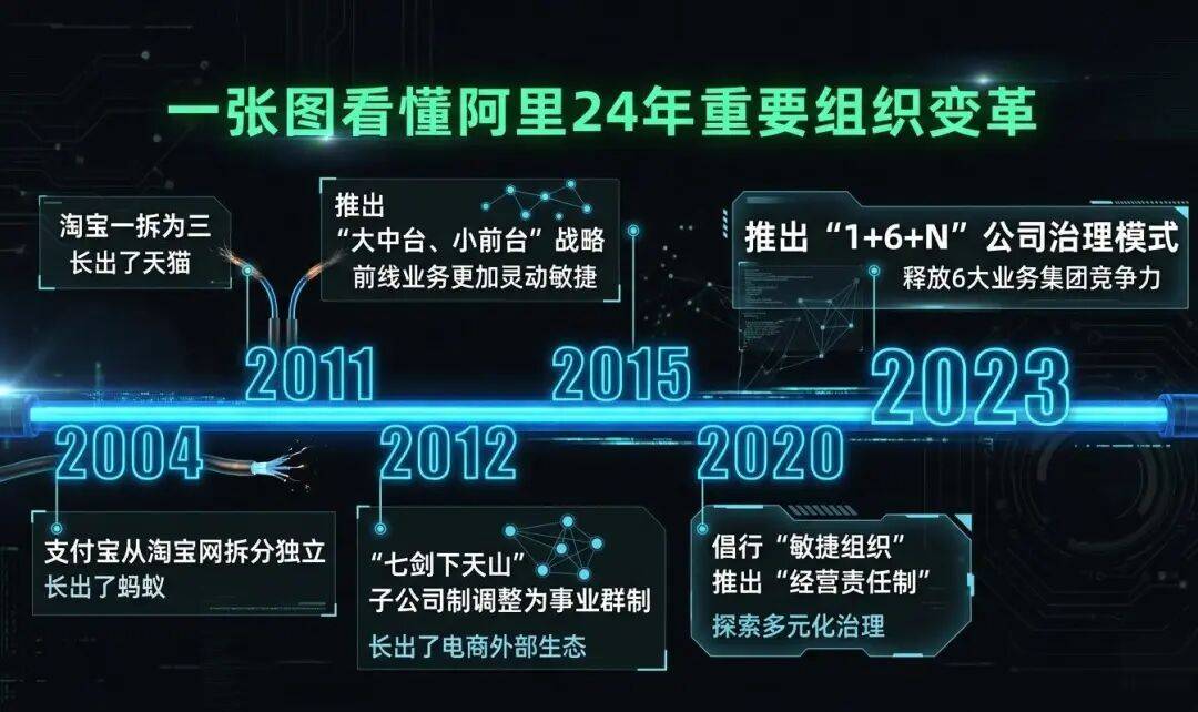 2012 年,马云退休前,阿里经历了那场著名的”七剑下天山”——面对着新兴的移动互联网浪潮,把庞大的集团切成六大业务集团和众多独立子公司,推行事业群制,把决策权下放,让大家在新的领域里发挥自己的创造力和战斗力。