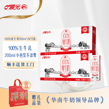 白菜!晨光 百分百全脂纯牛奶 200ml*24盒*2箱 赠礼袋新低59.9包邮(折1.24元/盒)