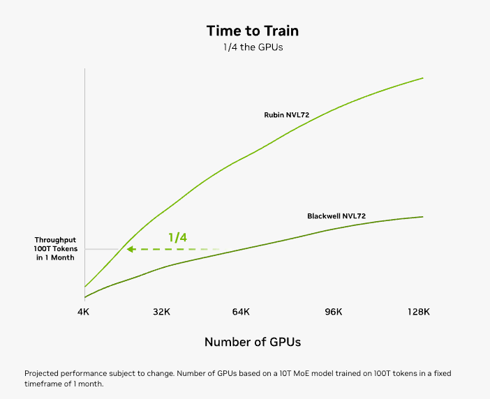 不过看数据,Rubin 还是相当能打的,在主力 Vera Rubin NVL72 机柜中,单机架能塞进 72 颗 Rubin GPU + 36 颗 Vera CPU,训练 MoE 模型只需上一代 Blackwell 的 1/4 GPU 算力,效率飞升,而且已经量产,预计是下半年出货。