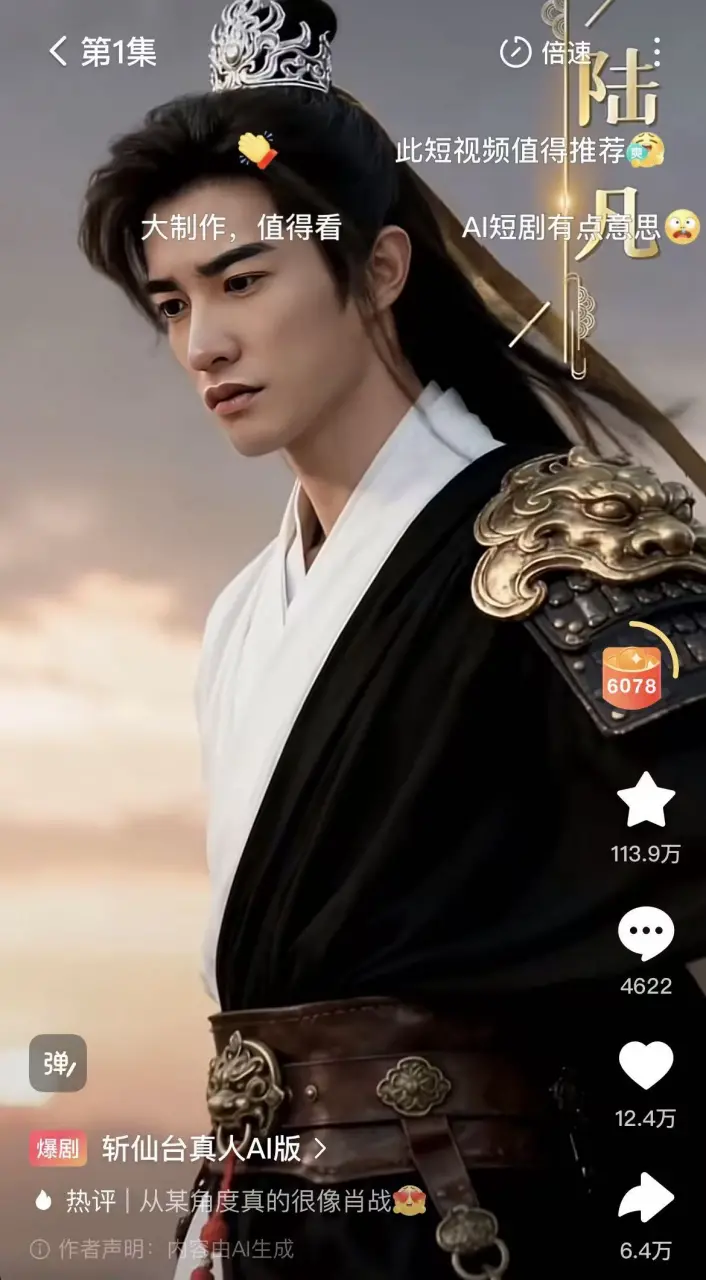 首先是视频生成质量跨过“可观看”门槛。以大爆的《斩仙台AI真人版》为例,这部作品之所以能让大家看下去,一个重要原因是 AI视频的真实感明显提升。人物皮肤、光影、动作细节已经接近真人质感,甚至能表现复杂的动作场景。