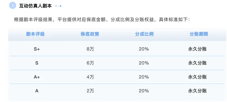 有意思的是,当时公告还提到,真人短剧剧本合作政策不变。而翻开过去的短剧合作政策,可以发现,同样是S+的剧本,保底政策是20万,分成比例是25%,都比AI仿真人剧要高。
