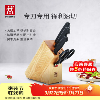 降35元新低价!目前京东旗舰店售价¥529,领取1件5折优惠券,到手实付新低264.5元包邮!套装包括中片刀、多用刀、剪刀、蔬果刀和实木刀架,以往最低299元。