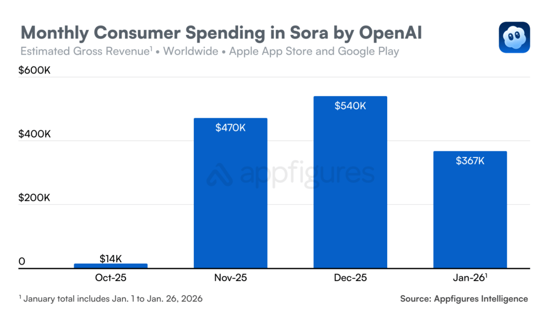 Appfigures数据显示,Sora App的用户付费已经从去年12月的54万美元,跌到今年1月的36.7万美元。