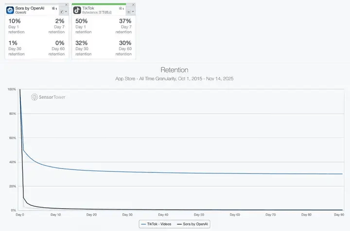 在 Sora 2 上线两个月的时间里,用户留存率经历了断崖式下降,次日留存 10%,第 7 天跌到 2%,到了第 30 天,这个数字已经变成了 1%,第 60 天近乎于无。