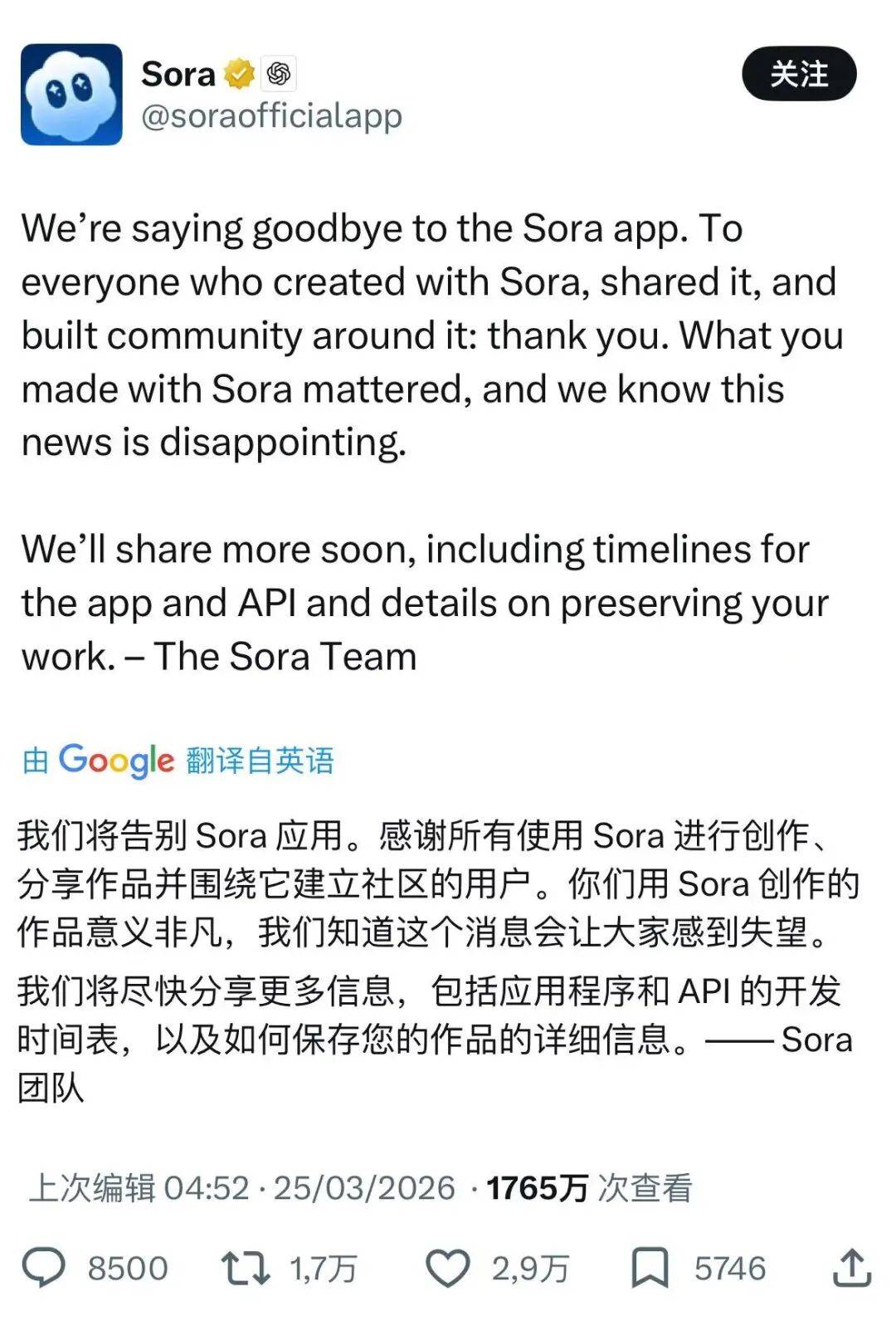随后,Sora 官方也在 X 上发文证实了这一点,只是没有解释具体的原因。