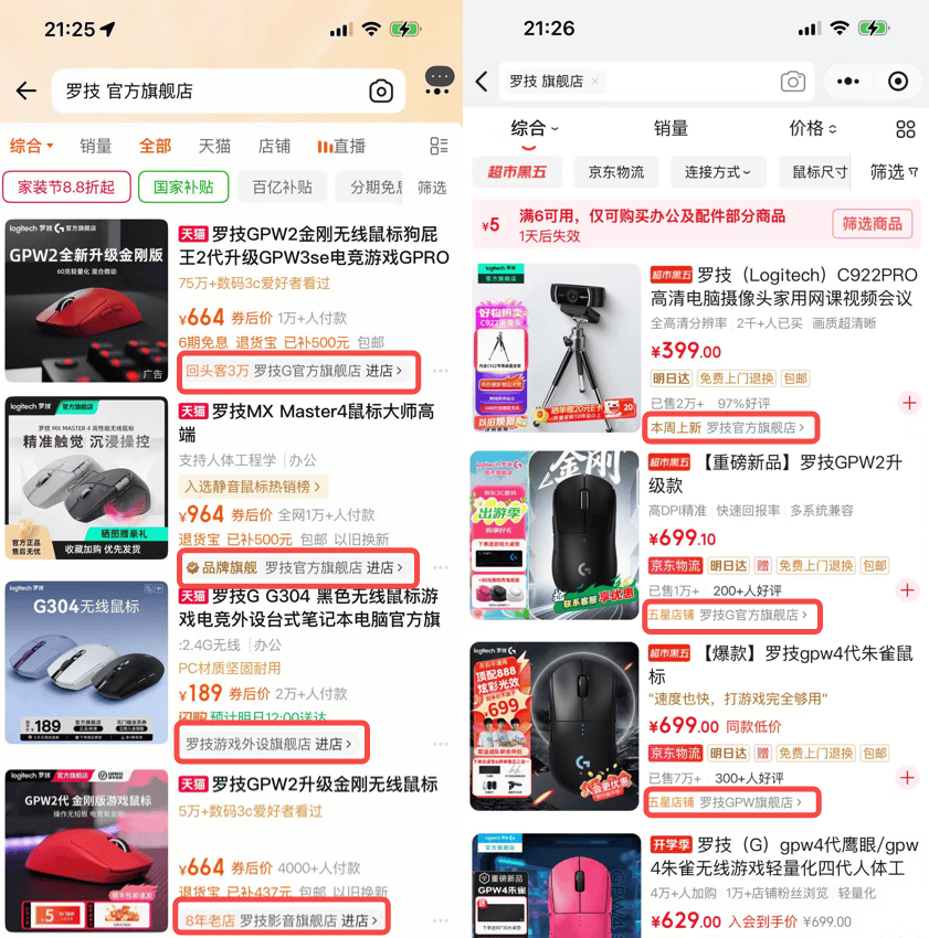 在各大电商平台搜罗技官方旗舰店,出来好几家旗舰店,名字像双胞胎似的,卖得东西也一样,这有啥差别?哪家是真官旗啊?