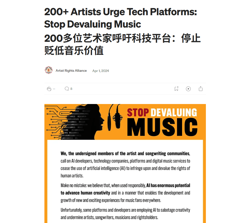其实不只是国内的底层从业者在哀嚎,早前也有数百位欧美知名音乐人发布联名信,抗议 AI 对音乐产业的无底线掠夺。