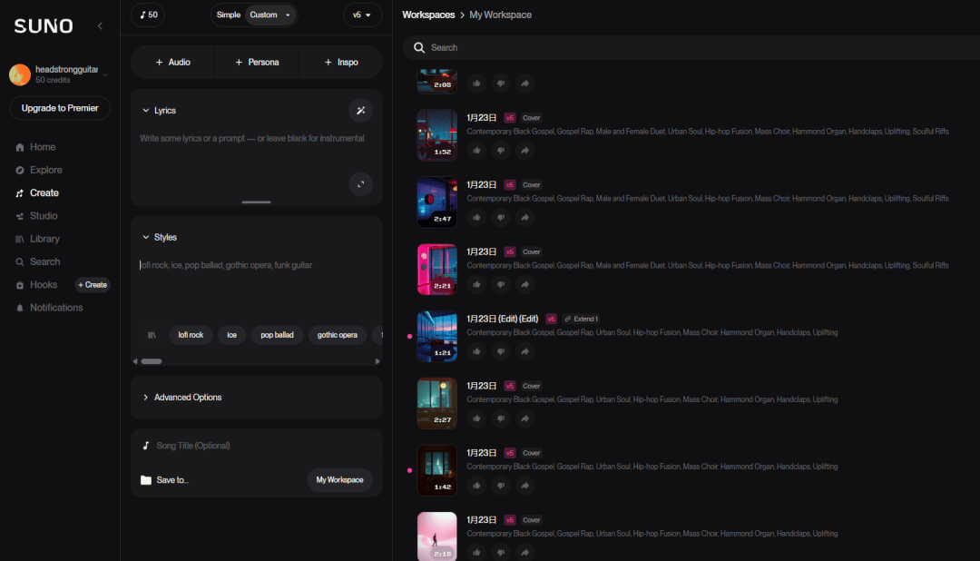 说实话,一耳朵确实蛮惊艳的。随便输入几句提示词,选个风格,十几秒就能吐出一首完整的歌,有副歌有和声还有转音,让人很能听下去。。