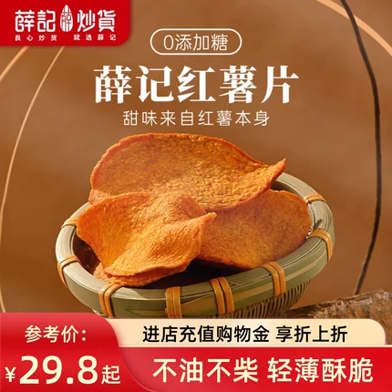 薛记优选,山东名吃,线下门店有售。精选河北原产地老品种红薯,香甜软糯红薯切片烤熟,片片酥脆,闲时看剧磨磨牙~目前天猫商城薛记炒货旗舰店135g*3袋售价¥29.8,可领¥9优惠券,20.8元包邮
