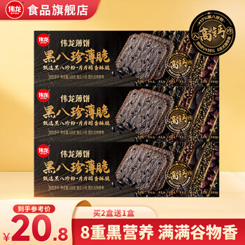 始于1993元,专注中式薄饼33年。8重黑营养,满满谷物香。目前京东商城伟龙食品旗舰店售价20.8元,叠加4元优惠券,实付16.8元包邮。