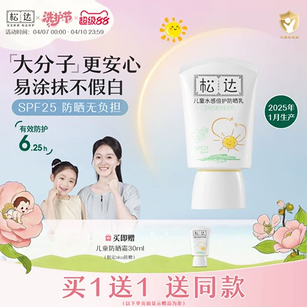特证上岗防晒,大分子水感防晒乳,SPF25PA++,更适合儿童的防晒指数,水感质地不假白,温和不刺激,宝宝敏感肌也能安心用。目前天猫商城松达官方旗舰店售价¥128.9,领取¥79优惠券,买一送一,新低49.9元包邮