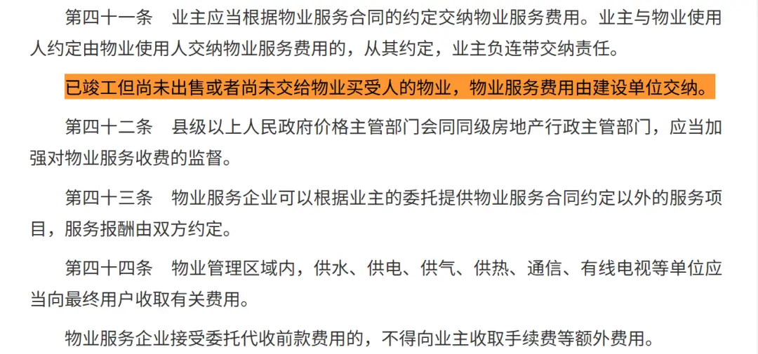虽然法律是这么写的,但开发商现在日子不好过,对于物业费必然是能拖则拖,或者干脆赖账,某些物业公司,干脆就是跟开发商一个集团的,爹欠儿子钱,你敢咋地,难道还去法院状告老爸?在很多新开发的区域,入住率能有30%到40%,都算是谢天谢地了,想光靠这些业主交钱养活物业是不现实的。
