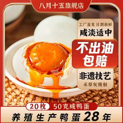 禾草灰传统腌制,自由觅食的散养麻鸭,流油起沙,自然醇香,蛋黄松沙质地,细腻爽滑,口感咸香适中,古法腌制,手工制作,高温杀菌,安全卫生!目前50g*20枚装天猫商城八月十五旗舰店售价¥35.9,官方立减12%,领取¥13优惠券,实付新低¥18.5包邮
