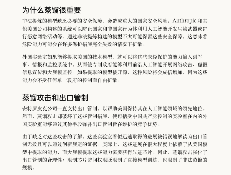 除此之外,在 Anthropic 的那份调查报告里,也提到了反蒸馏的另外一层考量。