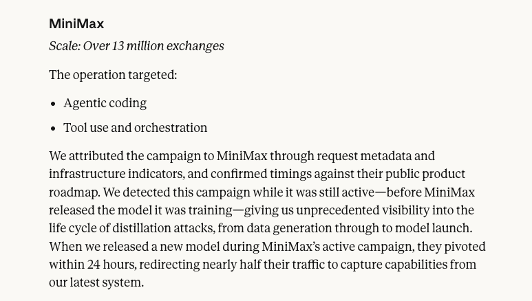 当时, Anthropic 甩出了一份调查报告,公开点名 DeepSeek、月之暗面和 MiniMax,说这三家公司弄了大概 2.4 万个欺诈账户,跟 Claude 交互超过 1600 万次,然后把套出来的精华数据全拿去训练自家的模型去了。