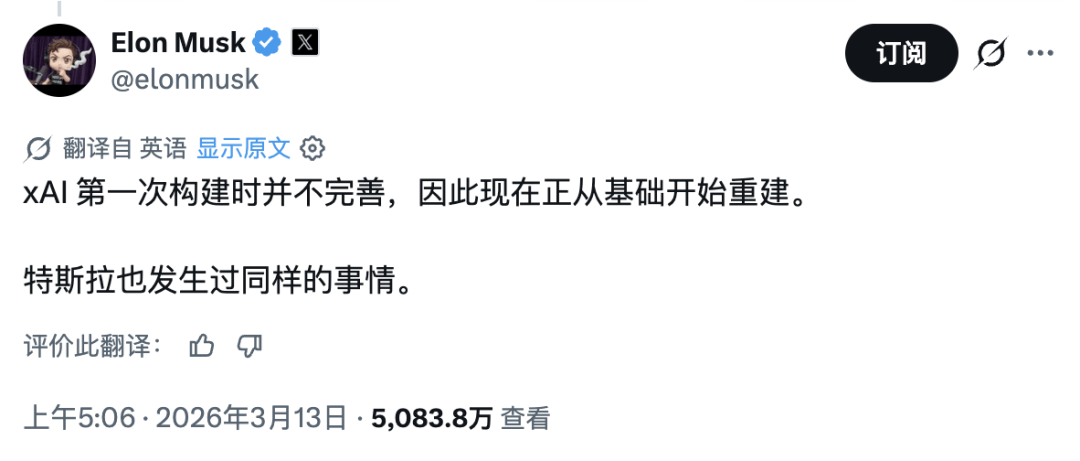 同一天,他在 X 平台发了条公开认错的推文:「xAI 第一次没搭对,正在从地基开始重建。」