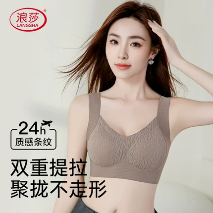 聚拢防下垂深V文胸,质感条纹,拼接蕾丝,聚拢调整立体版型,有效收副乳提拉胸部,无钢圈零束缚;无痕美背,无背扣BRA,运动日常皆宜。目前天猫商城浪莎拓程专卖店单件售价¥39.9,下单2件可使用¥20优惠券,59.9元包邮