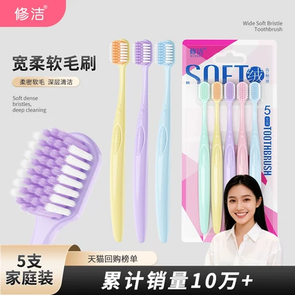 绵柔刷丝,宽幅刷头,0.15mm磨尖丝,曲线手柄,立体点阵纹,缓冲手指压力,防滑易握。目前5支装天猫商城修洁旗舰店售价¥8.9,领取¥3优惠券,5.9元包邮