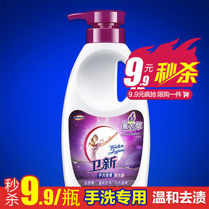 威露士 卫新薰衣草手洗洗衣液600ml,适用于高档衣物手洗,可去除多种顽固污渍,净白亮色,易熨更柔顺,散发怡人薰衣草清香。天猫旗舰店聚划算降至9.9元包邮 ,库存不多有需速抢,平常要39元起。