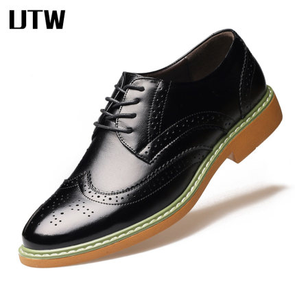 帮面采用二层牛皮材质,光泽细腻手感突出,具有柔软,排汗,穿着舒适等特点,皮质有弹性,坚实耐用,交织的鞋带,结实美观,不易松脱,为您行走提供保障,橡胶环保防滑大底,大大提升了穿着的舒适度和安全性,鞋头的布洛克雕花让鞋子交织在复古和时尚之间。